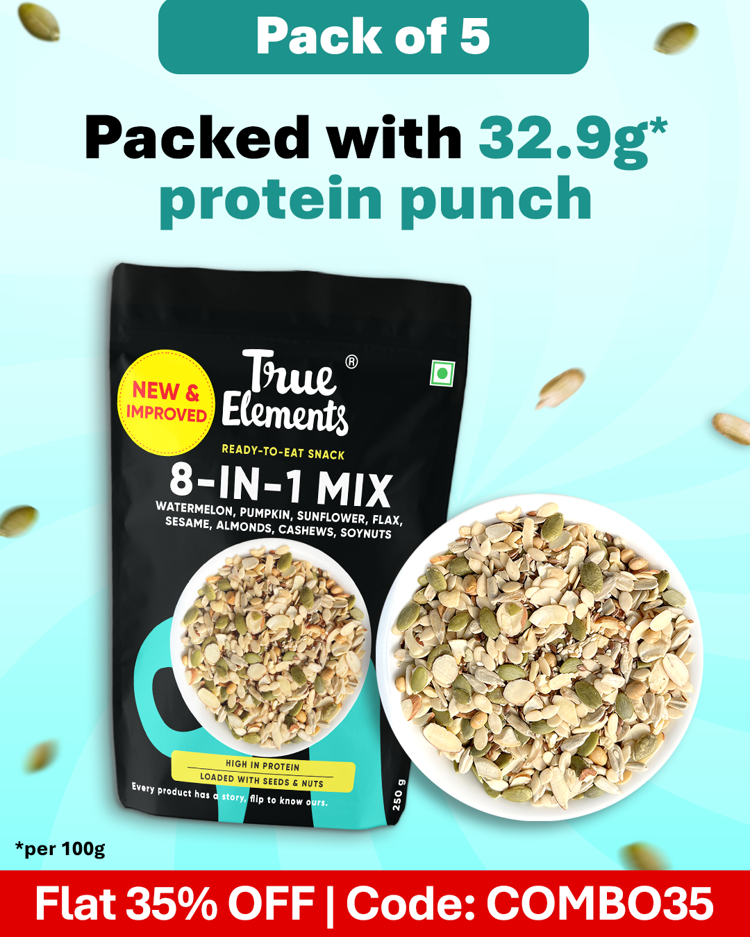 True Elements 8 in 1 Seed Mix is your all-in-one super-snack, packed with the power of watermelon, pumpkin, sunflower, flax, sesame, almonds, cashews, and soy nuts. No preservatives, no artificial ingredients, just pure, natural goodness. Loaded with protein, fiber, healthy fats, and essential vitamins & minerals, it’s here to fuel your day, curb cravings, and keep hunger at bay!